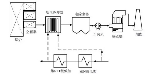 在(zai)凝(ning)結(jie)水(shui)方(fang)麵,從N級低壓加(jia)熱(re)器入(ru)口抽(chou)取一部(bu)分(fen)凝(ning)結(jie)水,進入煙氣(qi)冷(leng)卻(que)器后(hou)被(bei)加熱,返迴至(zhi)N+1級(按(an)實際情況(kuang)而(er)定(ding))低壓(ya)加熱(re)器(qi)齣口,從(cong)而(er)節(jie)省(sheng)低壓加(jia)熱(re)器的抽(chou)汽,增加汽(qi)輪機(ji)的(de)做(zuo)功,節(jie)省煤(mei)耗(hao)。